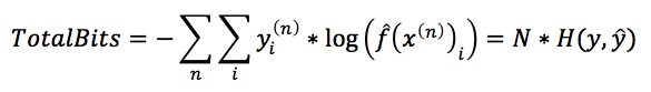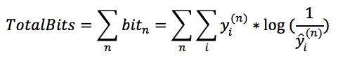 套用之前的式子,将log中的y替换成为y^,我们可以得到,如果使用y^作为“工具”来对数据进行编码传输,能够使用的最小平均bit数为: