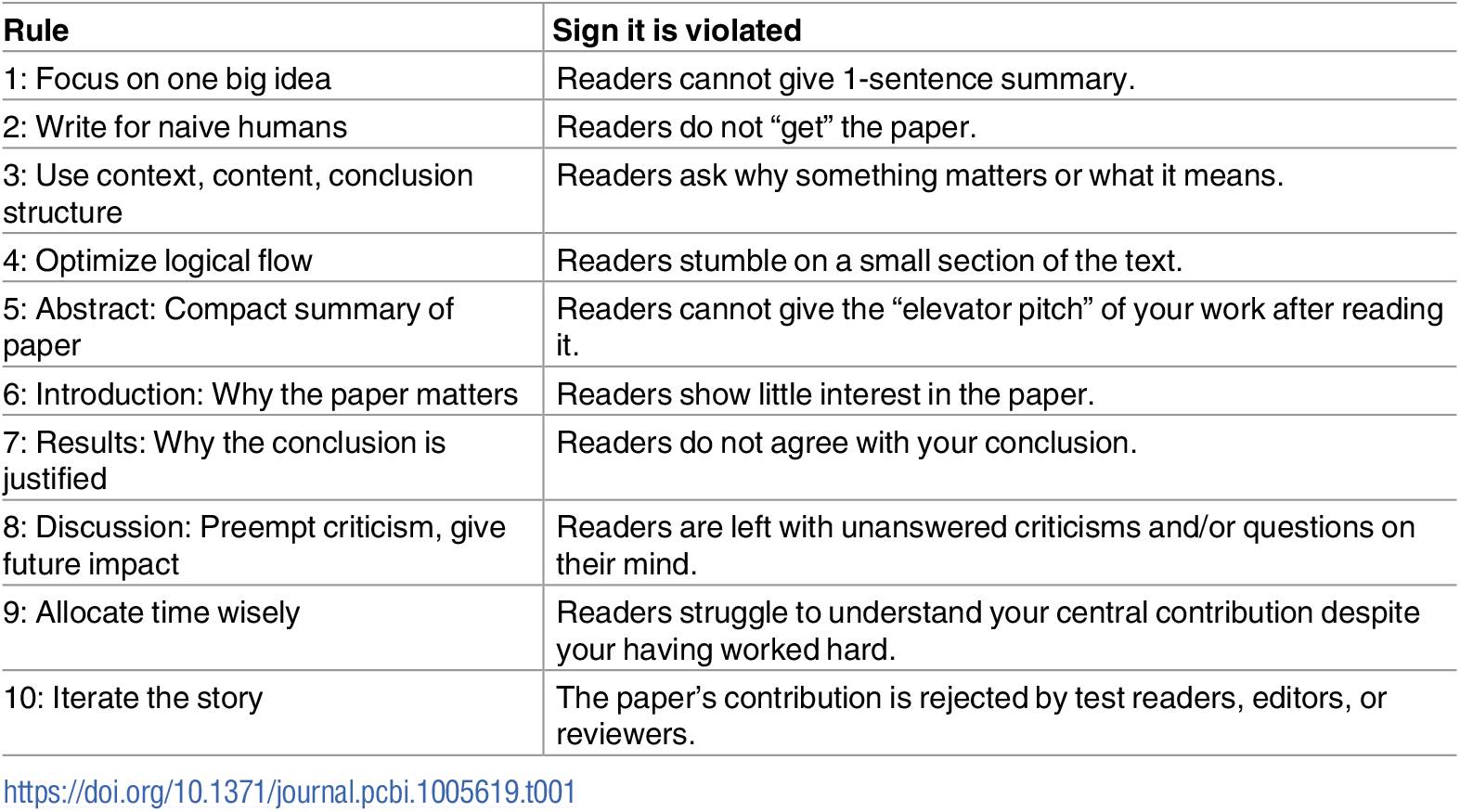 以下是优化论文结构的十条简单规则。前四条规则适用于论文的所有部分,以及其他沟通形式,比如许可和海报。中间四条规则有关论文主要部分各自的主要目标。最后两条规则为有效构建论文原稿提供了过程启发式的指导。