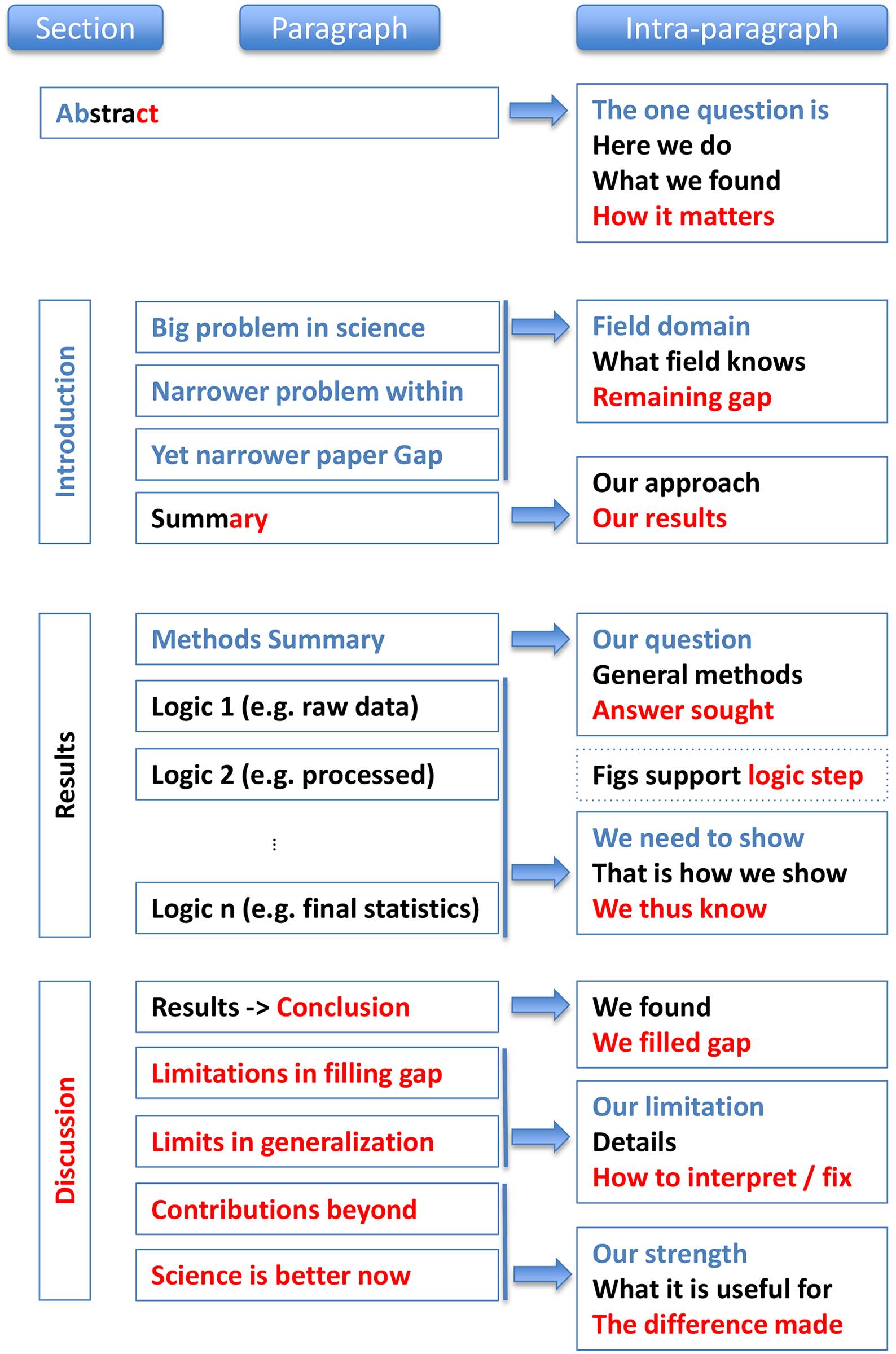 图 1. 论文三个重要部分的结构总结。Note:摘要是其中最特别的,它包含所有三个要素(原因、内容和结论),所以包含了所有三种颜色。