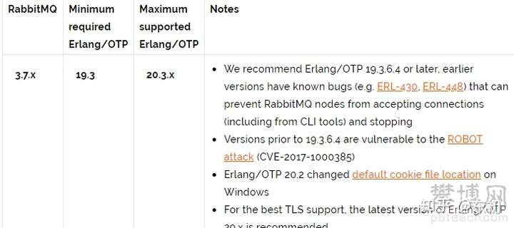 RabbitMQ由Erlang语言开发,Erlang语言用于并发及分布式系统的开发,在电信领域应用广泛,OTP(Open Telecom Platform)作为Erlang语言的一部分,包含了很多基于Erlang开发的中间件及工具库,安装RabbitMQ需要安装Erlang/OTP,并保持版本匹配,如下图:
