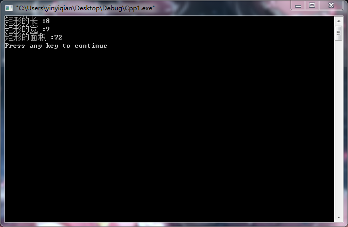 #include<iostream> using namespace std; class Rectangle{ //定义矩形类 public: //公共成员接口 Rectangle(double i,double j); //构造函数 Rectangle(Rectangle &R); //复制构造函数 ~Rectangle(); //析构函数 double area(double length,double width){ return length*width; }; //计算矩形面积,内联函数 private: //私有成员接口 double length; double width; }; Rectangle::Rectangle(double i,double j){ //构造函数,定义数据类型 length = i; width = j; } Rectangle::Rectangle(Rectangle &R){ //析构函数 length = R.length; width = R.width; } Rectangle::~Rectangle() { } int main(){ double length,width; cout << "矩形的长 :" ; //输入长的值 cin >> length; cout << "矩形的宽 :"; //输入宽的值 cin >> width; Rectangle R1(length,width); //定义rectangle类的对象R1 cout << "矩形的面积 :" << R1.area(length,width) << endl; return 0; }