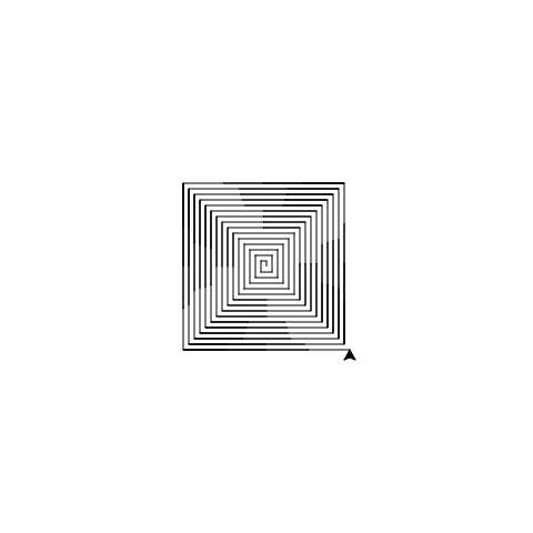 import turtle # 设置画笔初始方向为向上(90度) turtle.left(90) # 初始线段长度 length = 5 # 设置画笔移动速度 turtle.speed(20) for i in range(30): # 向前绘制当前长度的线段 turtle.forward(length) # 向左转90度 turtle.left(90) # 再次向前绘制当前长度的线段 turtle.forward(length) # 向左转90度 turtle.left(90) # 每次循环让线段长度增加5,以形成螺旋效果 length += 5 # 保持图形窗口显示 turtle.done()