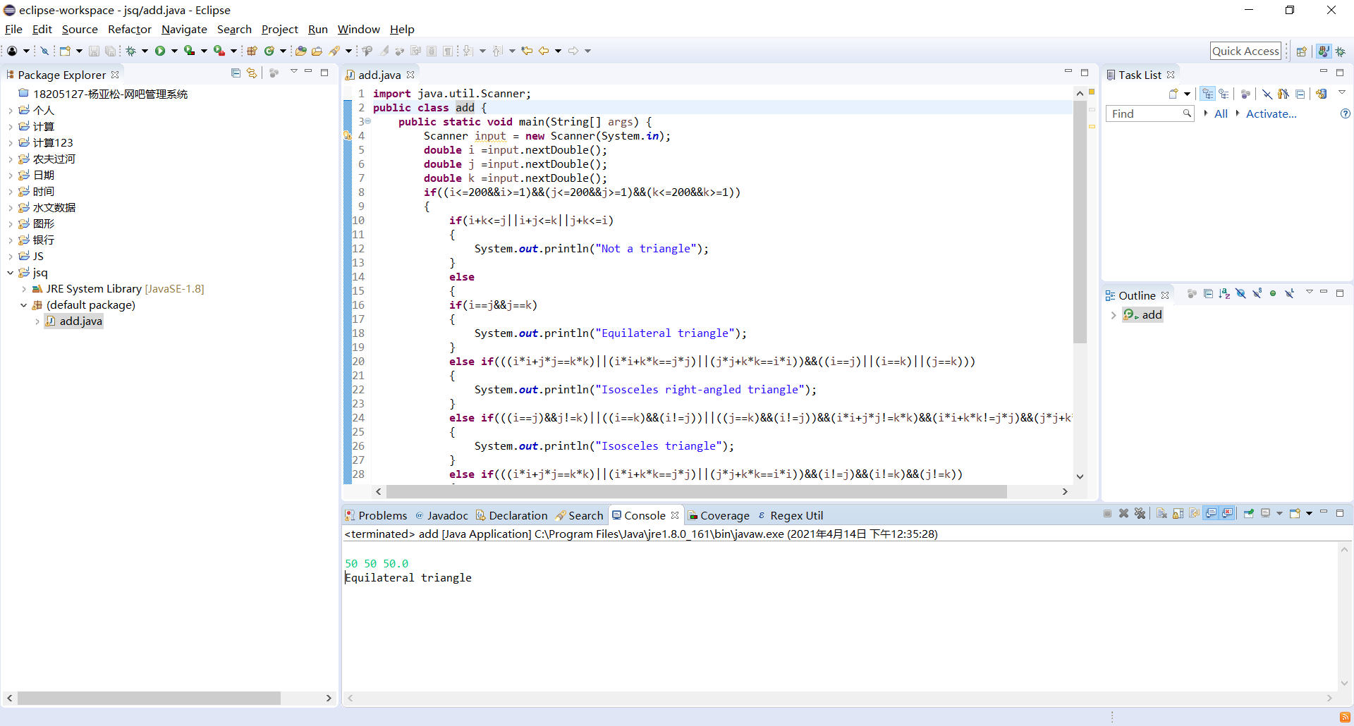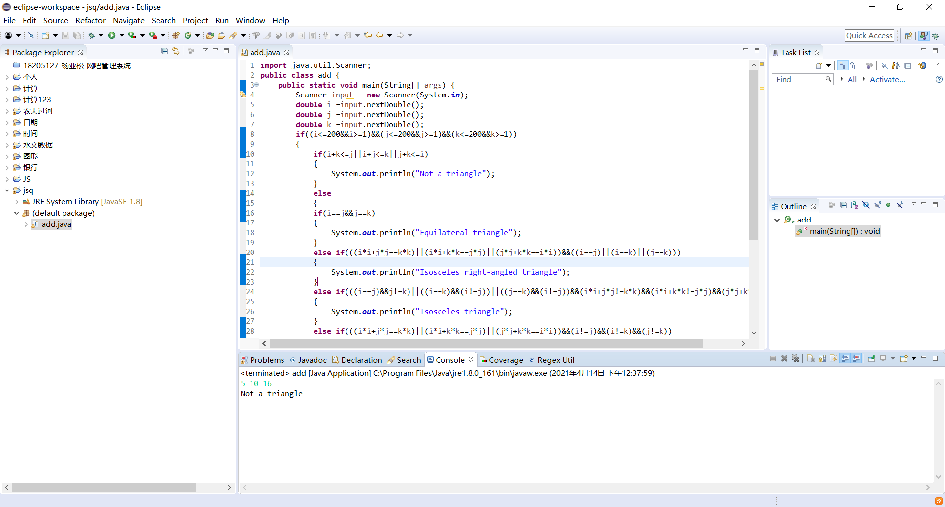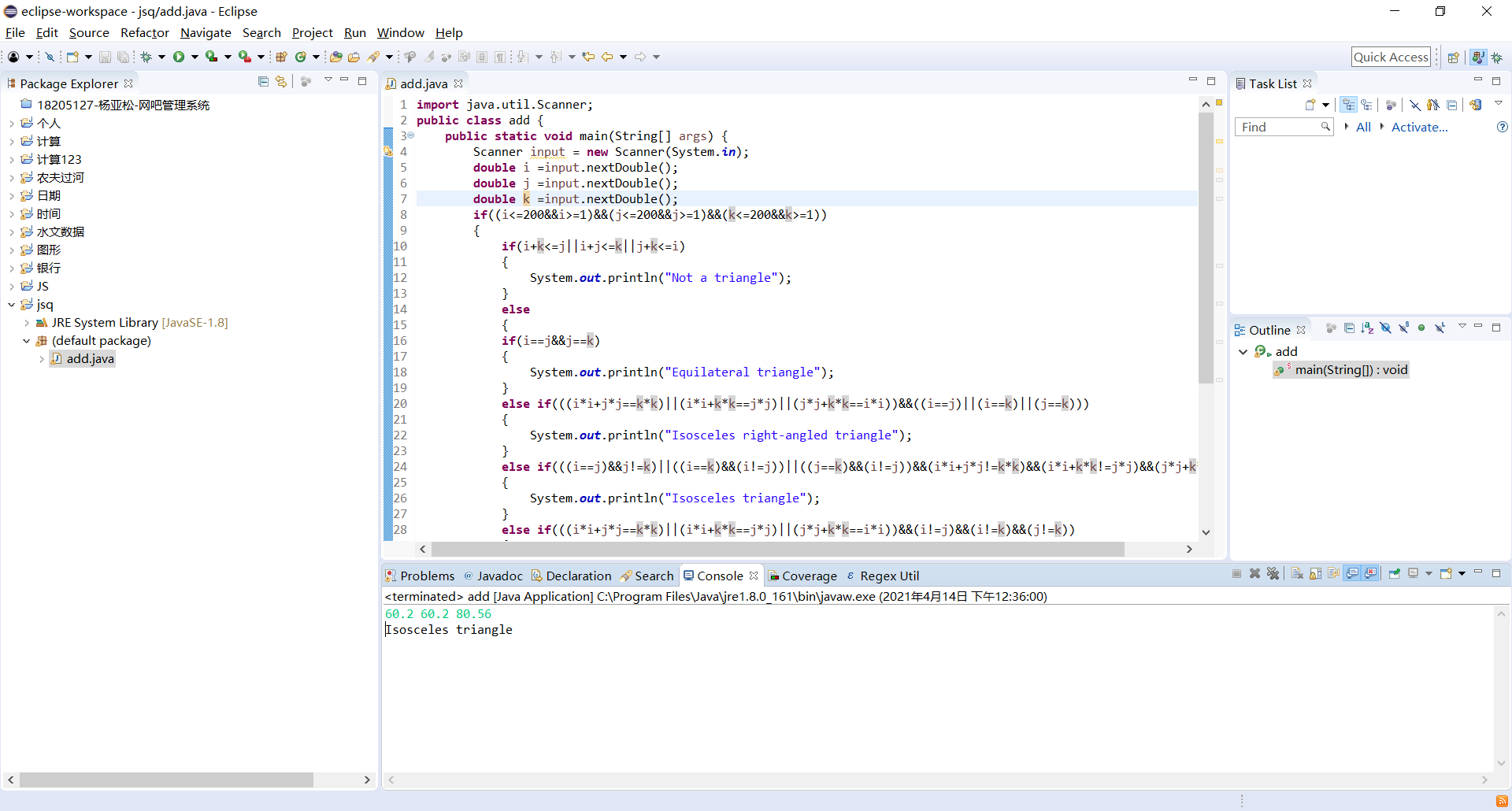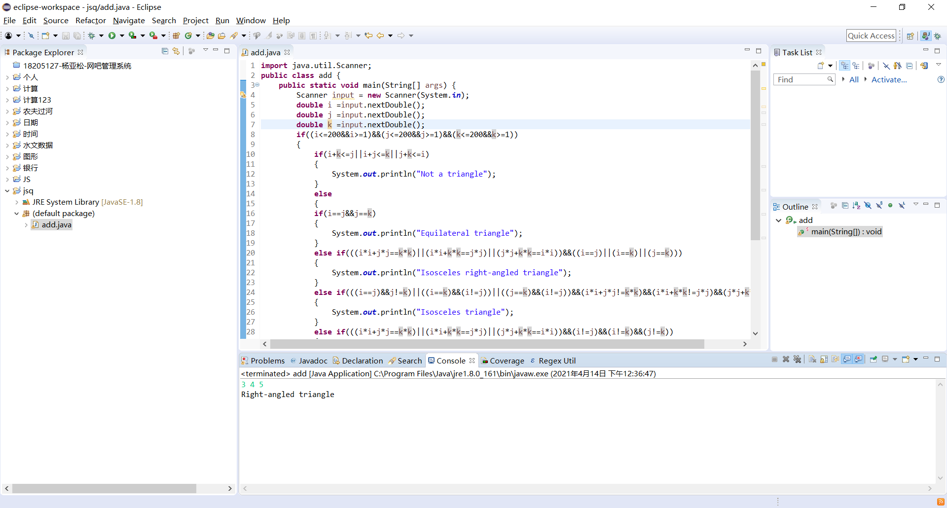 最后一题7-8判断条件麻烦点,而且需要区分输出,比如,等腰直角三角形既满足等腰三角形又满足直角三角形的判断条件,但是只能输出等腰直角三角形。