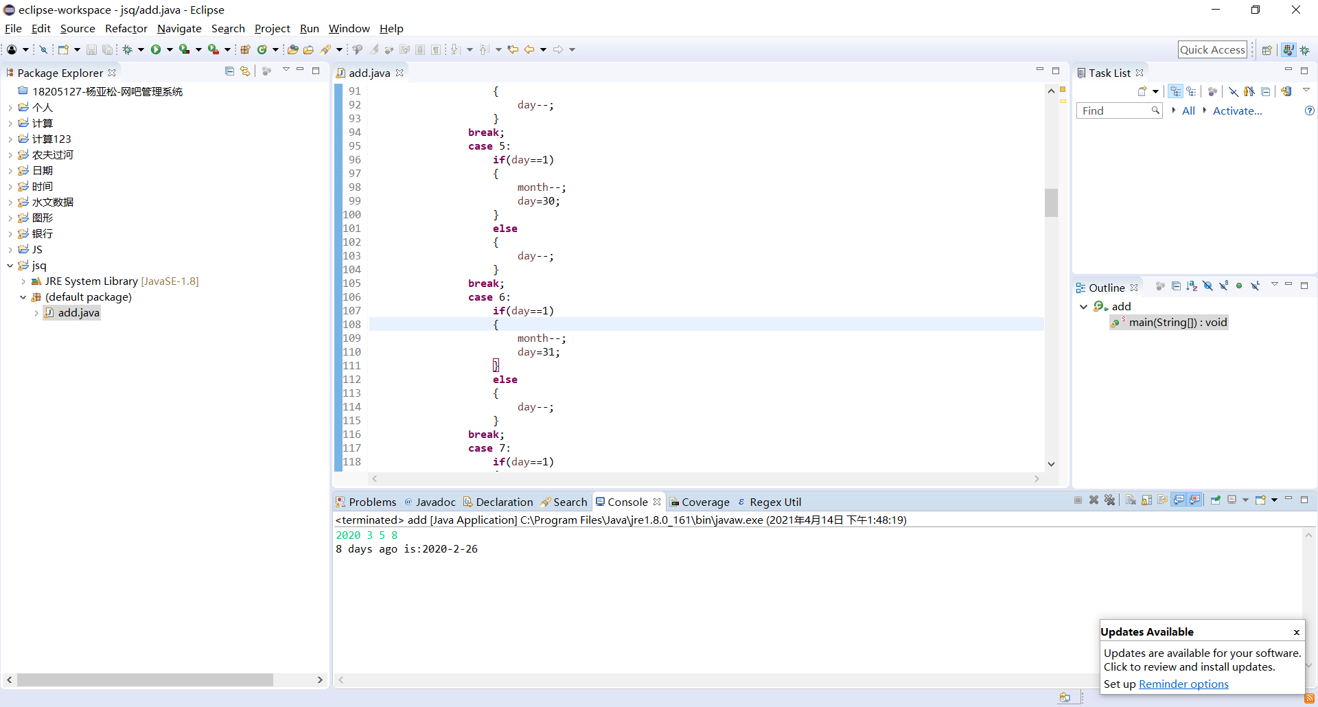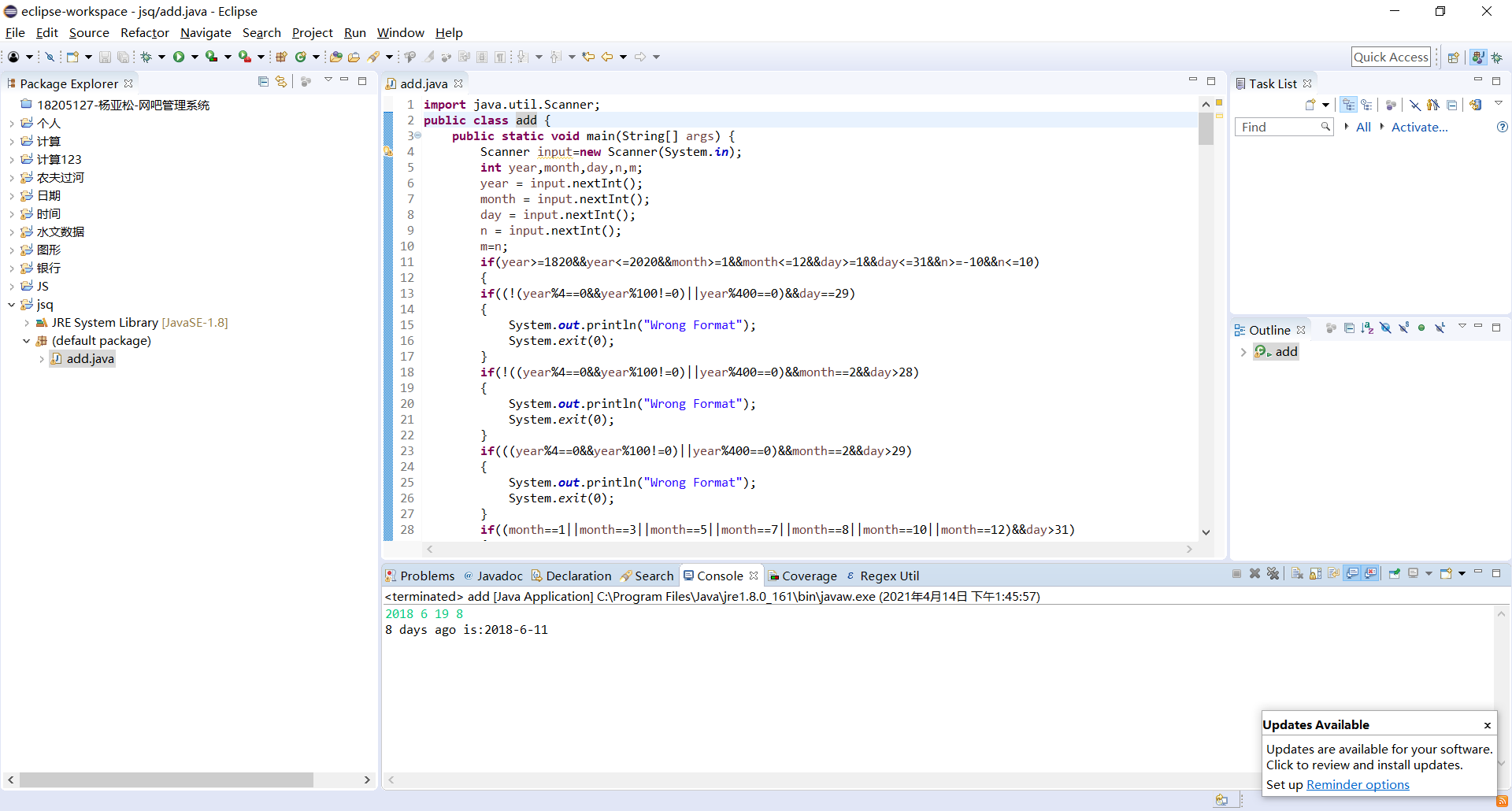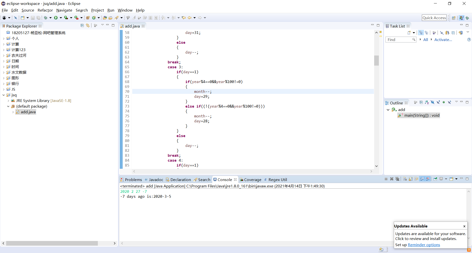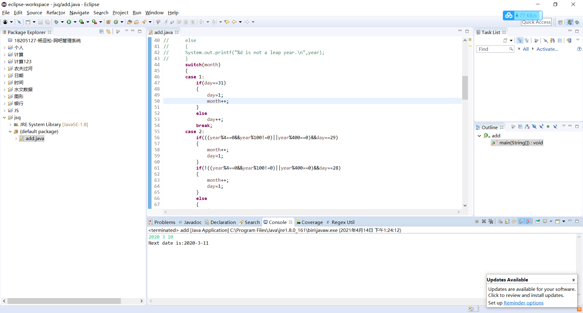 关于2月的后一天,我折腾了好久,这个闰年和平年的判断条件,括号什么的老写多一个或者少一个,当时印象比较深刻,所以这一题过后我把闰年的判断条件写成了一个方法,需要的时候直接调用就好。