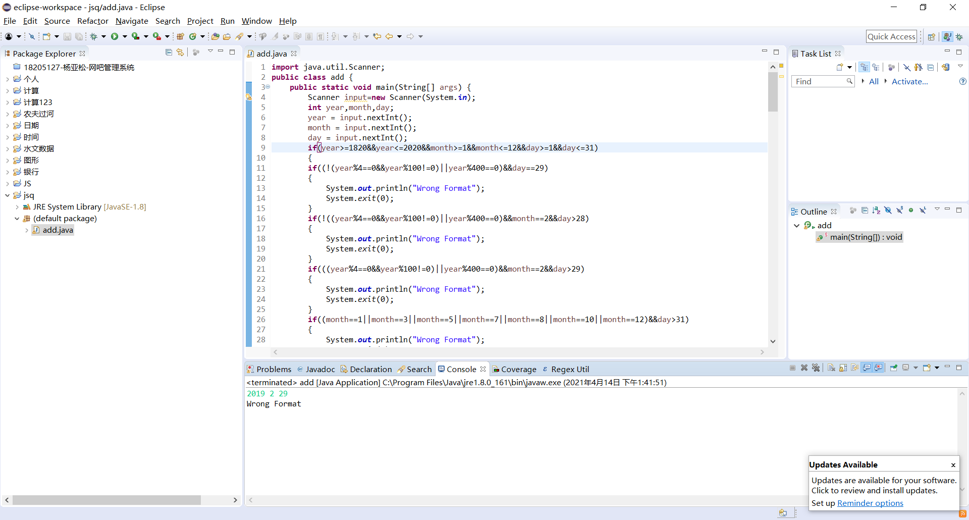 如果输入的年是闰年但是输入2月的时候日期大于29,那输出Date Format is Wrong,程序结束