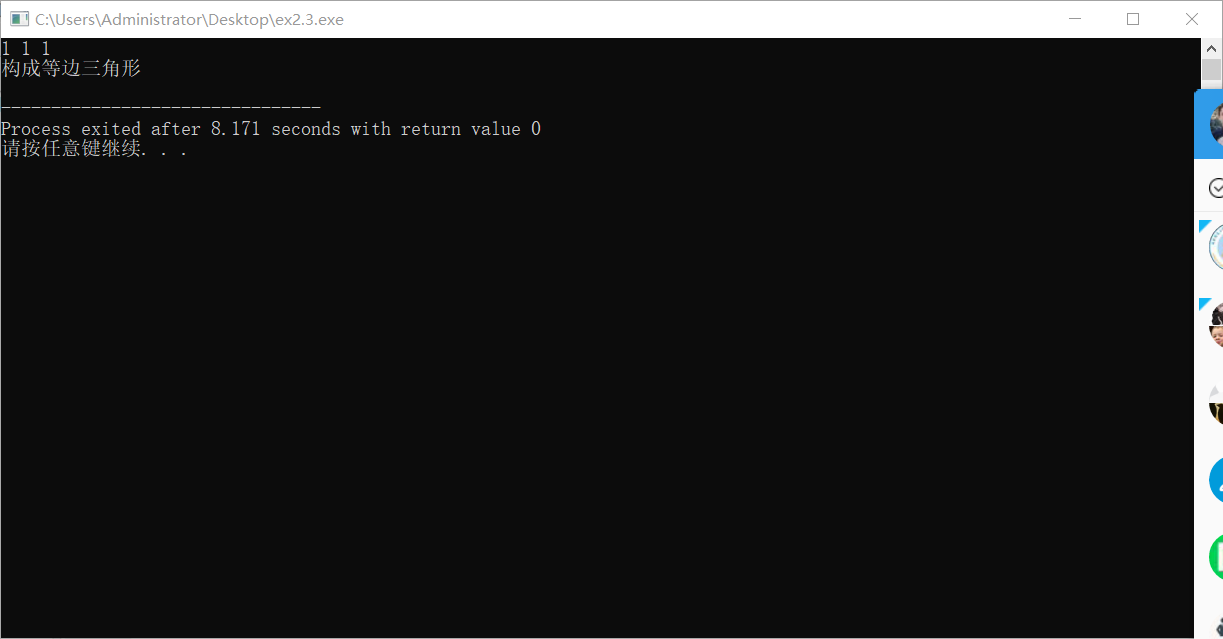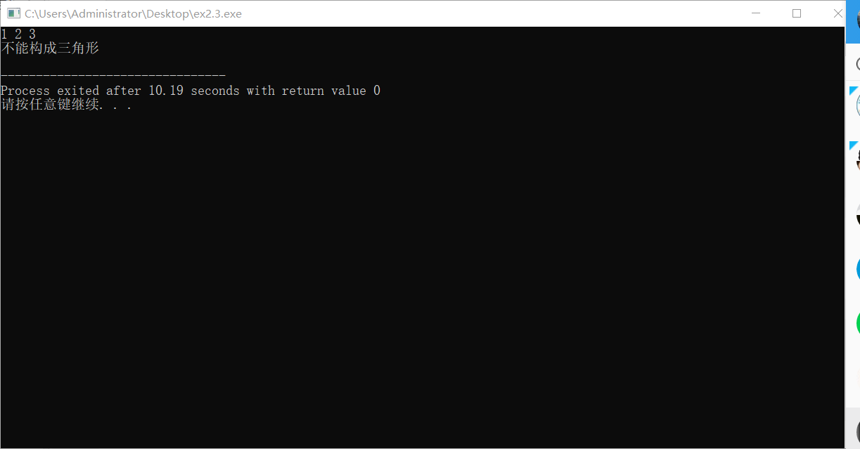 #include <stdio.h> int main() { double a,b,c; scanf("%lf %lf %lf", &a, &b, &c); if(a<0 || b<0 || c<0) printf("不能构成三角形\n"); else if(a+b>c && a+c>b && b+c>a) { if(a==b && a==c) printf("构成等边三角形\n"); else if(a==b || a==c || b==c) printf("构成等腰三角形\n"); else printf("构成一般三角形\n"); }else printf("不能构成三角形\n"); return 0; }