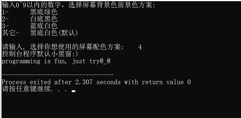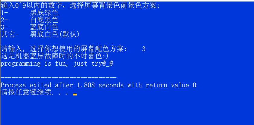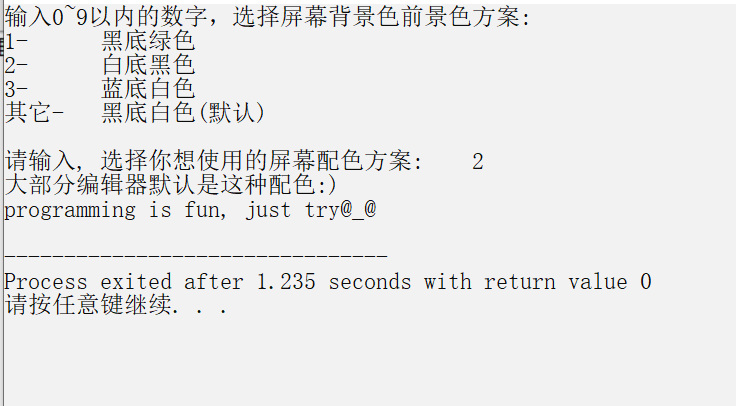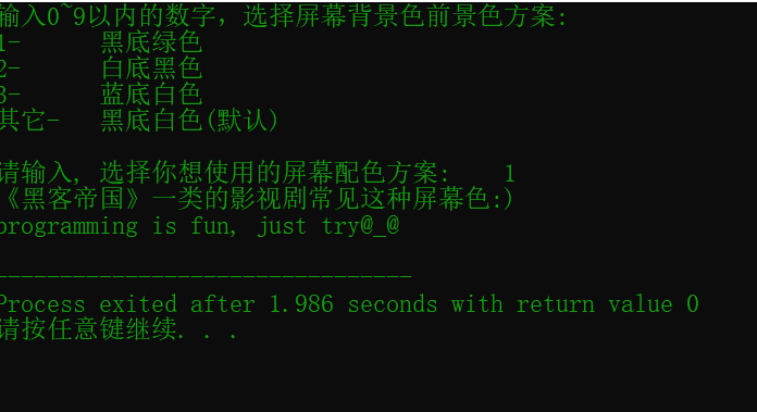 #include <stdlib.h> int main() { char choice; // 显示菜单 printf("输入0~9以内的数字,选择屏幕背景色前景色方案: \n"); printf("1-\t黑底绿色\n"); printf("2-\t白底黑色\n"); printf("3-\t蓝底白色\n"); printf("其它-\t黑底白色(默认)\n"); printf("\n请输入, 选择你想使用的屏幕配色方案: "); // 要求用户从键盘输入0~9的数字,选择屏幕配色方案 choice = getchar(); // 根据用户输入,设置屏幕配色方案 if (choice == '1') { system("color 02"); printf("《黑客帝国》一类的影视剧常见这种屏幕色:)\n"); } else if(choice == '2') { system("color f0"); printf("大部分编辑器默认是这种配色:)\n"); } else if(choice == '3') { system("color 1f"); printf("这是机器蓝屏故障时的不讨喜色:)\n"); } else { system("color 0f"); printf("控制台程序默认小黑窗:)\n"); } printf("programming is fun, just try@_@\n"); return 0; }