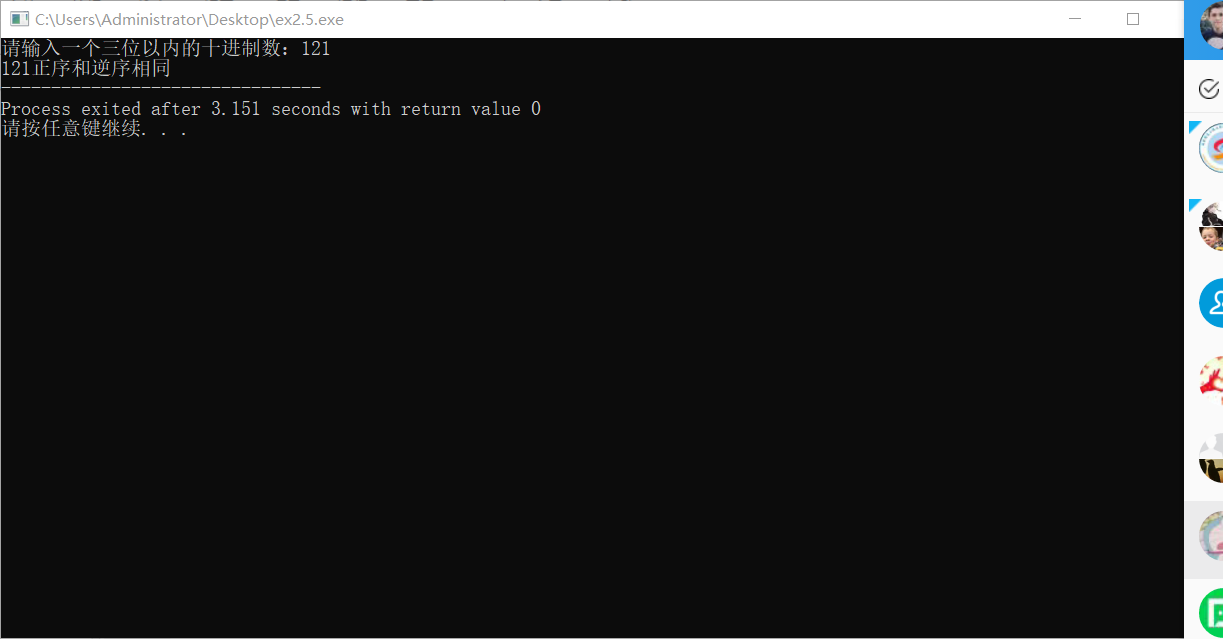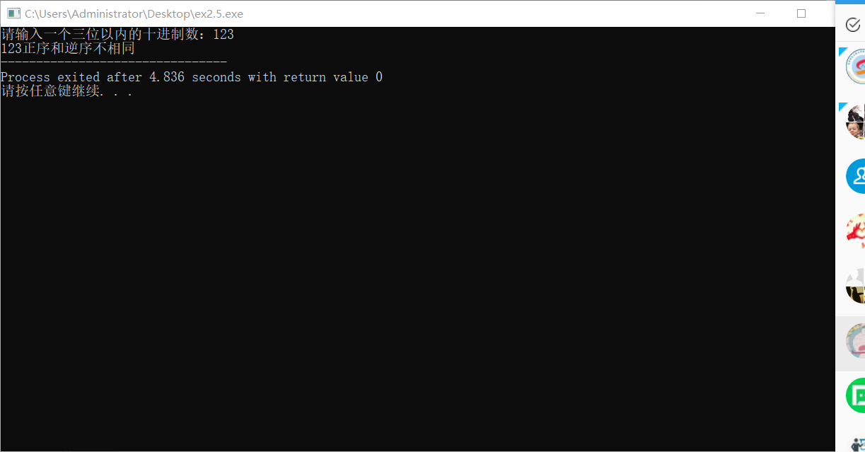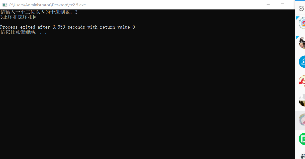 #include<stdio.h> int main() { int a,b,c; printf("请输入一个三位以内的十进制数:"); scanf("%d",&a); b=a/10+(a%10)*10; c=a/100+(a/10-(a/100)*10)*10+((a%100)%10)*100; if(a>=0&&a<10) printf("%d正序和逆序相同",a); else if(a==b||a==c) printf("%d正序和逆序相同",a); else printf("%d正序和逆序不相同",a); return 0; }