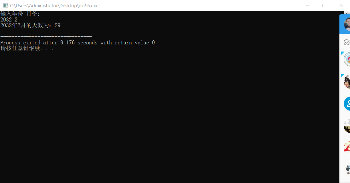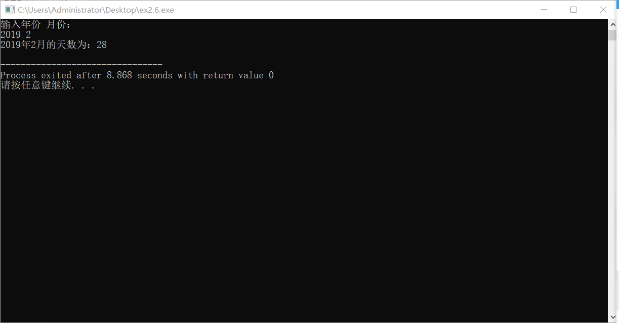 #include<stdio.h> #include<stdlib.h> int main() { printf("输入年份 月份:\n"); int y,m,d,r; scanf("%d%d",&y,&m); if(y<=0||m<1||m>12) { printf("输入的数据错误!\n"); exit(0); } r=y%400==0||y%4==0&&y%100!=0; if(m==1||m==3||m==5||m==7||m==8||m==10||m==12) d=31; else if(m==4||m==6||m==9||m==11) d=30; else {d=28+r;} printf("%d年%d月的天数为:%d\n",y,m,d); return 0; }