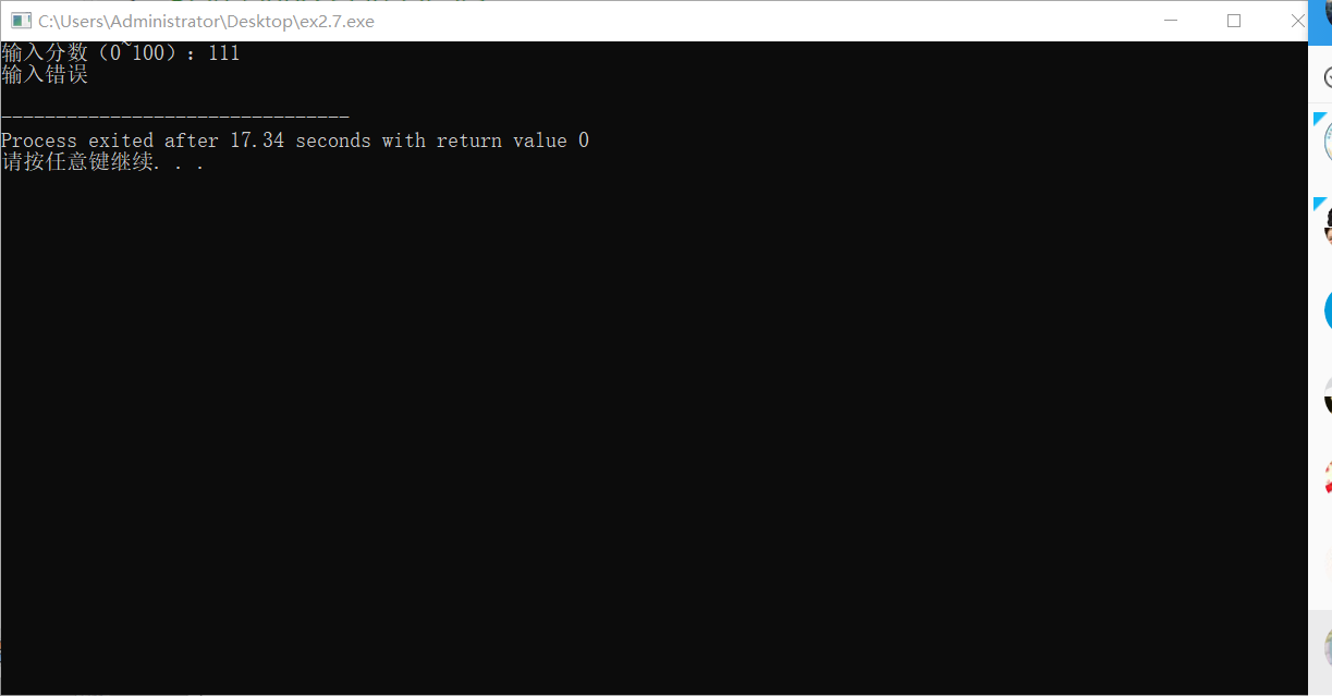 #include<stdio.h> #include<stdlib.h> int main() { printf("输入分数(0~100):"); int score; scanf("%d",&score); if(score<0||score>100) { printf("输入错误\n"); exit(0); } switch(score/10) { case 10: case 9:printf("优秀\n");break; case 8:printf("良好\n");break; case 7:printf("中等\n");break; case 6:printf("及格\n");break; default:printf("不及格\n");break; } return 0; }
