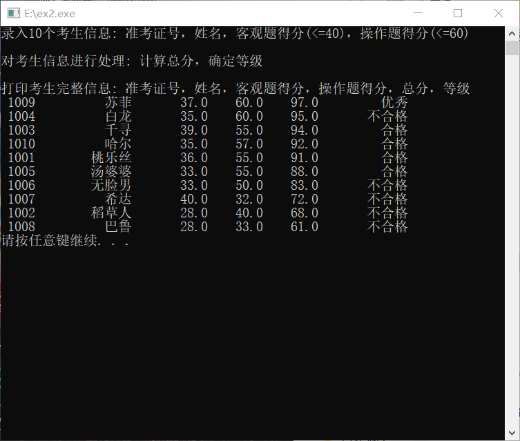 printf("\n打印考生完整信息: 准考证号,姓名,客观题得分,操作题得分,总分,等级\n");