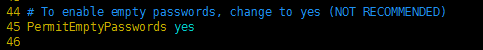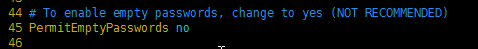 2) 将PermitEmptyPasswords 参数值修改为yes,如下图: