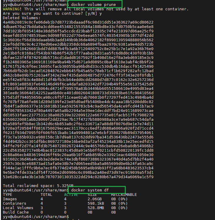 如果卷占用空间过高,可以清除一些不使用的卷,包括一些未被任何容器调用的卷(-v 详细信息中若显示 LINKS = 0,则是未被调用):