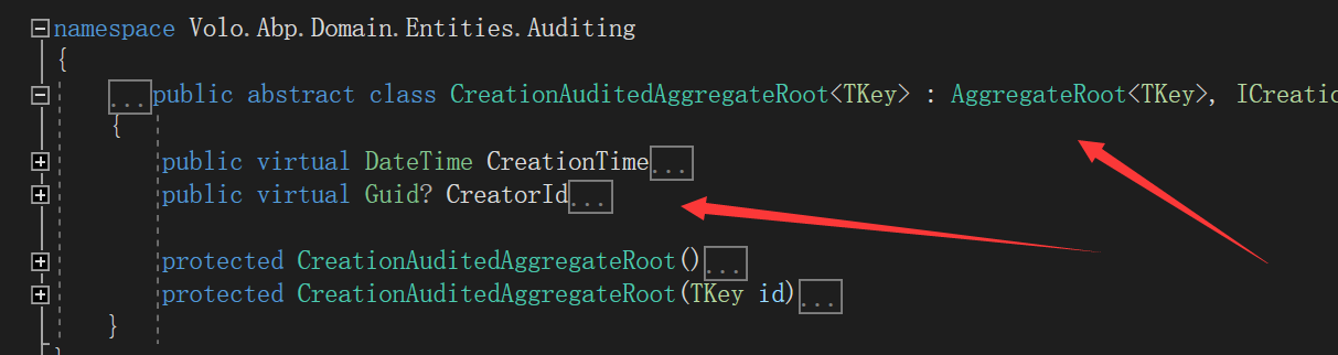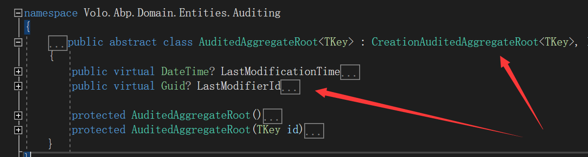 AuditedAggregateRoot<TKey> 增加了 DateTime? LastModificationTime 修改时间 Guid? LastModifierId 修改人 同时实现了CreationAuditedAggregateRoot<TKey>