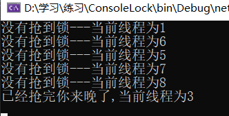 Console.WriteLine($"没有抢到锁---当前线程为{Thread.CurrentThread.ManagedThreadId}");