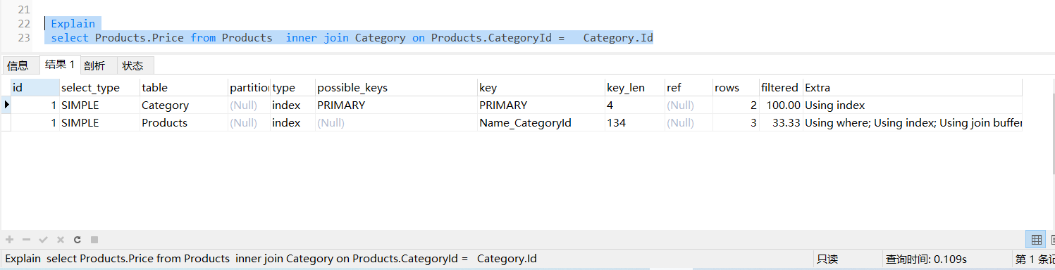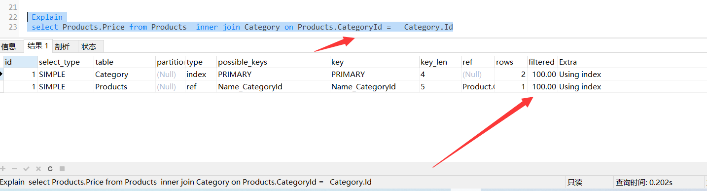 Explain select Products.Price from Products inner join Category on Products.CategoryId = Category.Id