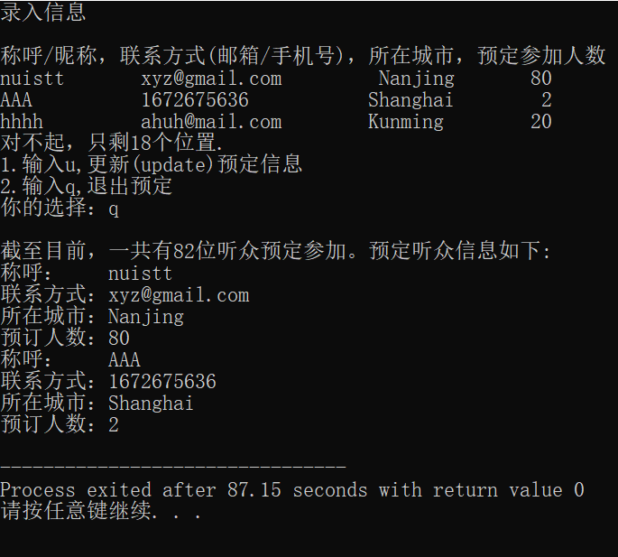 #include"Info.hpp" #include<iostream> #include<vector> int main(){ vector<Info>audience_info_list; const int capacity=100; string nickname0,contack0,city0; int n0,k=0; cout<<"录入信息"<<endl<<endl; cout<<"称呼/昵称,联系方式(邮箱/手机号),所在城市,预定参加人数"<<endl; while(cin>>nickname0,cin>>contack0,cin>>city0,cin>>n0){ k+=n0; Info c1(nickname0,contack0,city0,n0); audience_info_list.push_back(c1); if(k==capacity) break; else if(k>capacity){ cout<<"对不起,只剩"<<capacity-k+n0<<"个位置."<<endl; cout<<"1.输入u,更新(update)预定信息"<<endl; cout<<"2.输入q,退出预定" <<endl; cout<<"你的选择:"; k-=n0; char z; cin>>z; int t=0; if(z=='q'){ audience_info_list.pop_back(); break; } else if(z=='u'){ audience_info_list.pop_back(); continue; } } } cout<<endl<<"截至目前,一共有"<<k<<"位听众预定参加。预定听众信息如下:"<<endl; for(auto it=audience_info_list.begin();it!=audience_info_list.end();++it){ it->print(); } }