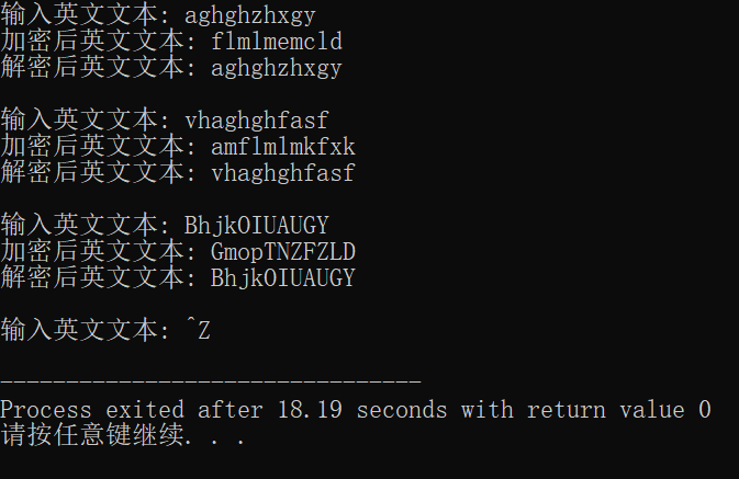 #include "Textcoder.hpp" #include <iostream> #include <string> int main() { using namespace std; string text, encoded_text, decoded_text; cout << "输入英文文本: "; while (getline(cin, text)) { encoded_text = TextCoder(text).encoder(); // 这里使用的是临时无名对象 cout << "加密后英文文本:\t" << encoded_text << endl; decoded_text = TextCoder(encoded_text).decoder(); // 这里使用的是临时无名对象 cout << "解密后英文文本:\t" << decoded_text << endl; cout << "\n输入英文文本: "; } }