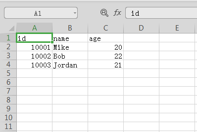1 import csv 2 3 with open('data.csv', 'w') as csvfile: 4 writer = csv.writer(csvfile, lineterminator='\n') 5 writer.writerow(['id', 'name', 'age']) 6 writer.writerow(['10001', 'Mike', '20']) 7 writer.writerow(['10002', 'Bob', '22']) 8 writer.writerow(['10003', 'Jordan', '21'])