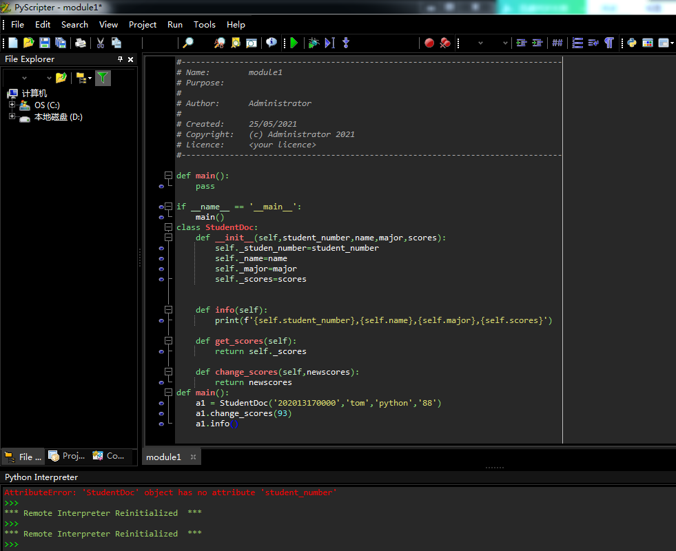 class StudentDoc: def __init__(self,student_number,name,major,scores): self._studen_number=student_number self._name=name self._major=major self._scores=scores def info(self): print(f'{self.student_number},{self.name},{self.major},{self.scores}') def get_scores(self): return self._scores def change_scores(self,newscores): return newscores def main(): a1 = StudentDoc('202013170000','tom','python','88') a1.change_scores(93) a1.info()