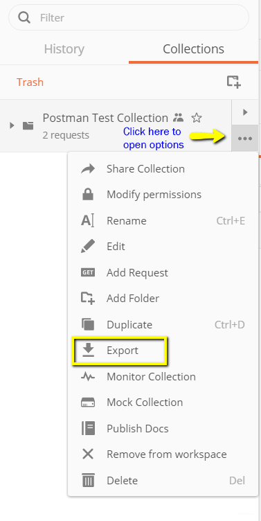 Newman安装好之后,让我们回到Postman的workspace。在Collections框中,单击三个点 … 会出现新的选择选项,可看到Export选项,如下图: