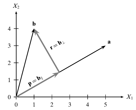 Def.4. \(\mathbf{a}, \mathbf{b} \in \mathbb{R}^{d}\),向量 \(\mathbf{b}\) 沿向量 \(\mathbf{a}\) 方向的正交分解是指,将 \(\mathbf{b}\) 写成:\(\mathbf{b}= \mathbf{p}+ \mathbf{r}\)。其中,\(\mathbf{p}\) 是指 \(\mathbf{b}\) 在 \(\mathbf{a}\) 方向上的正交投影,\(\mathbf{r}\) 是指 \(\mathbf{a}\) 与 \(\mathbf{b}\) 之间的垂直距离。