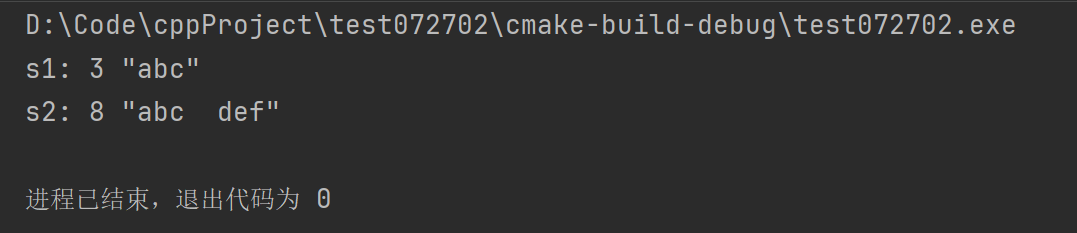 std::cout << "s2: " << s2.size() << " \"" << s2 << "\"\n";