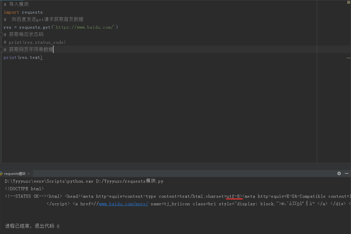 # print(res.text) # 获取网页字符串数据,如下图 所示(爬取数据出现乱码是因为字符编码不对,如下方红线所划,于是要在此命令前加上一行 res.encoding = 'utf8')