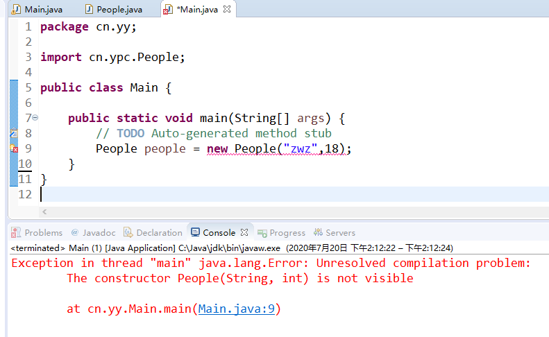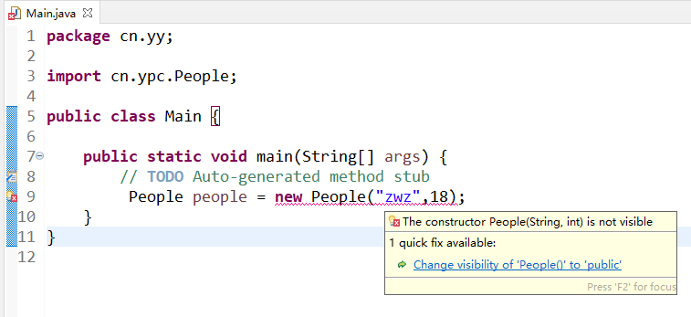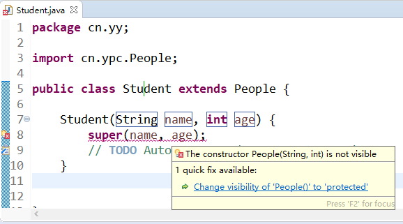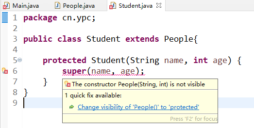 我们在cn.ypc(下面简称A包)的People的构造方法,改成 protected 类型