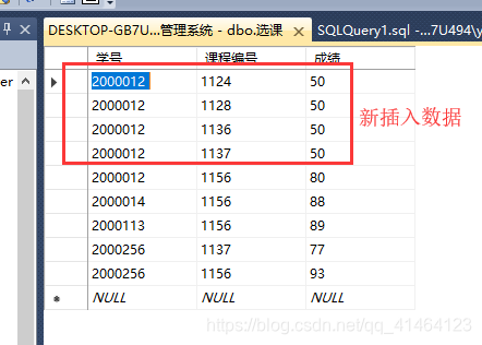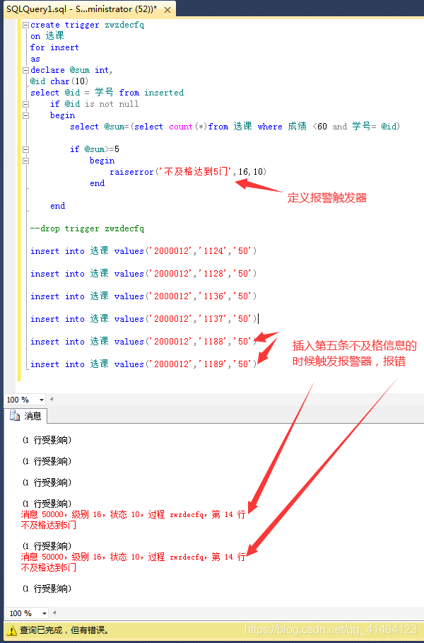 1.1题目:为选课表分别建立插入和更新触发器,如果当前学生累计不及格门数达到5门则给出警示信息