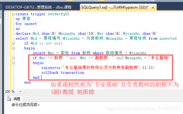2.1.1 题目:为课程表分别建立插入触发器来建立约束规则:“专业基础”课的教师必须为“教授”或“副教授”,如果不满足约束则拒绝操作,并给出错误信息。