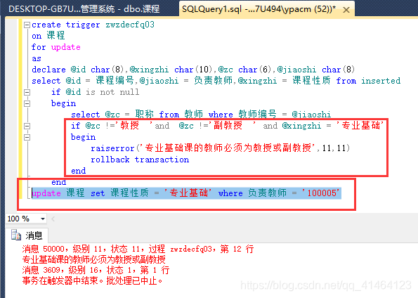 2.2.1 题目:为课程表分别建立更新触发器来建立约束规则:“专业基础”课的教师必须为“教授”或“副教授”,如果不满足约束则拒绝操作,并给出错误信息。