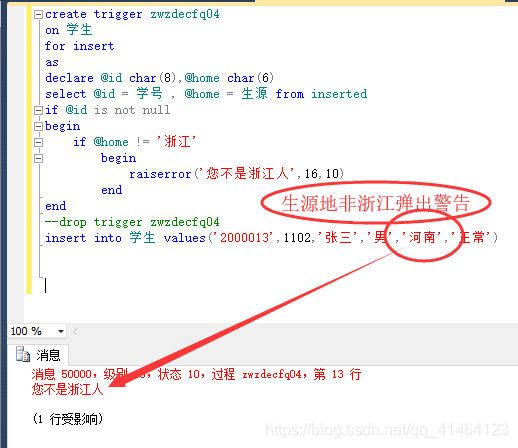 在学生表中定义一个触发器,当插入的数据生源列不为’浙江’的时候,弹出警告,先尝试插入非浙江学生,报错;后插入一个浙江学生,正常插入。