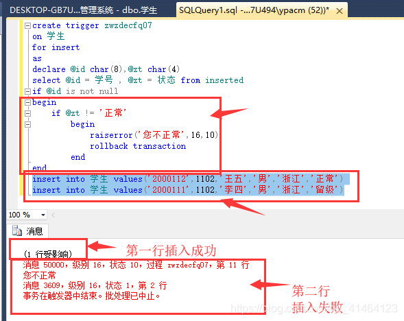 在学生表中定义一个触发器,当插入的学生数据 状态列 不为’正常’的时候,弹出警告,先尝试插入状态为留级的记录,报错;后插入状态为正常的记录,正常插入。