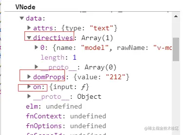 在patch之前还有一个生成vnode的过程,这个过程没有什么特别之处,所有的包括指令,属性会以data属性的形式传递到构造函数Vnode中,最终的Vnode拥有directives,domProps,on属性: