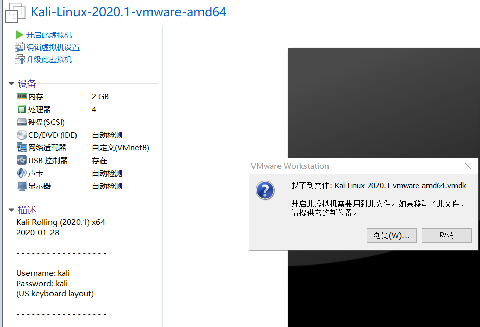kali通过VM虚拟机vmx文件给定,通过扫描虚拟机可以直接导入。其网卡设置如下(选择VMnet8模式):