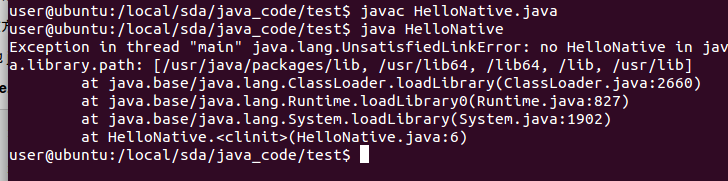 先让大家注意的是native方法,那个加载库的到后面也起作用。native 关键字告诉编译器(其实是JVM)调用的是该方法在外部定义,这里指的是C。如果大家直接运行这个代码, JVM会告之:“A Java Exception has occurred.”控制台输出如下: