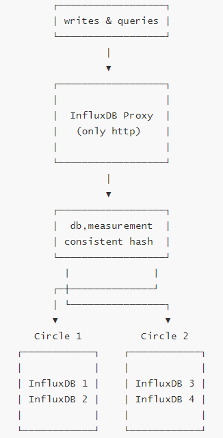 # 配置文件 /opt/influx-proxy/proxy.json { "circles": [ { "name": "circle-1", "backends": [ { "name": "influxdb-1-1", "url": "http://192.168.1.11:8086", "username": "root", "password": "123456", "auth_secure": false }, { "name": "influxdb-1-2", "url": "http://192.168.1.11:8087", "username": "root", "password": "123456", "auth_secure": false } ] }, { "name": "circle-2", "backends": [ { "name": "influxdb-2-1", "url": "http://192.168.1.12:8086", "username": "root", "password": "123456", "auth_secure": false }, { "name": "influxdb-2-2", "url": "http://192.168.1.12:8087", "username": "root", "password": "123456", "auth_secure": false } ] } ], "listen_addr": ":7076", "db_list": [], "data_dir": "/mnt/data/influx-pr/data", "tlog_dir": "/mnt/data/influx-pr/log", "hash_key": "idx", "flush_size": 10000, "flush_time": 1, "check_interval": 1, "rewrite_interval": 10, "conn_pool_size": 20, "write_timeout": 10, "idle_timeout": 10, "username": "root", "password": "123456", "auth_secure": false, "write_tracing": false, "query_tracing": false, "https_enabled": false, "https_cert": "", "https_key": "" }