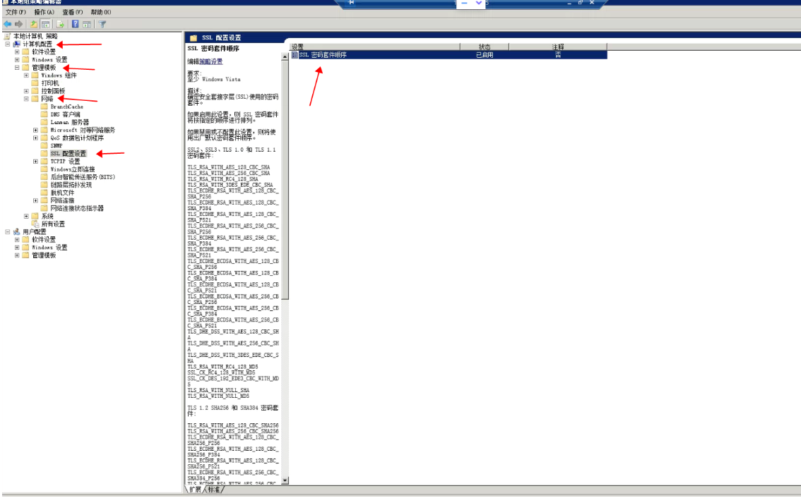 ### 3、在“SSL密码套件顺序”选在“已启用(E)” ,在“SSL密码套件”下修改SSL密码套件算法,仅保留TLS 1.2 SHA256 和 SHA384 密码套件、TLS 1.2 ECC GCM 密码套件。