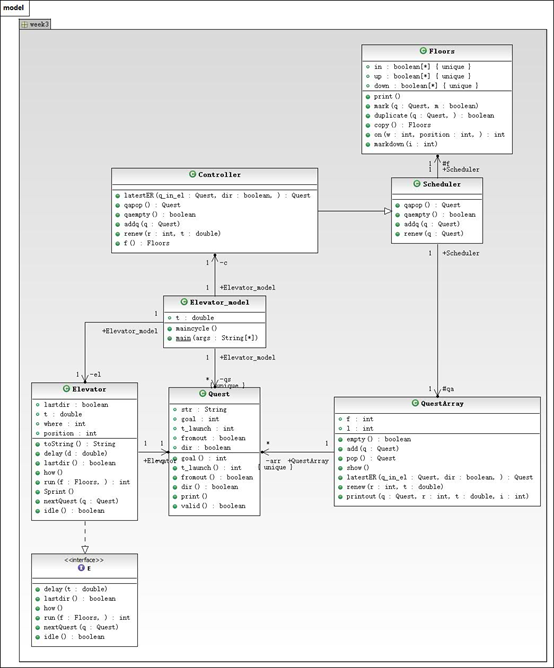 类之间的关系:Scheduler类调用了Elavator类,Request类的方法实现输出。
