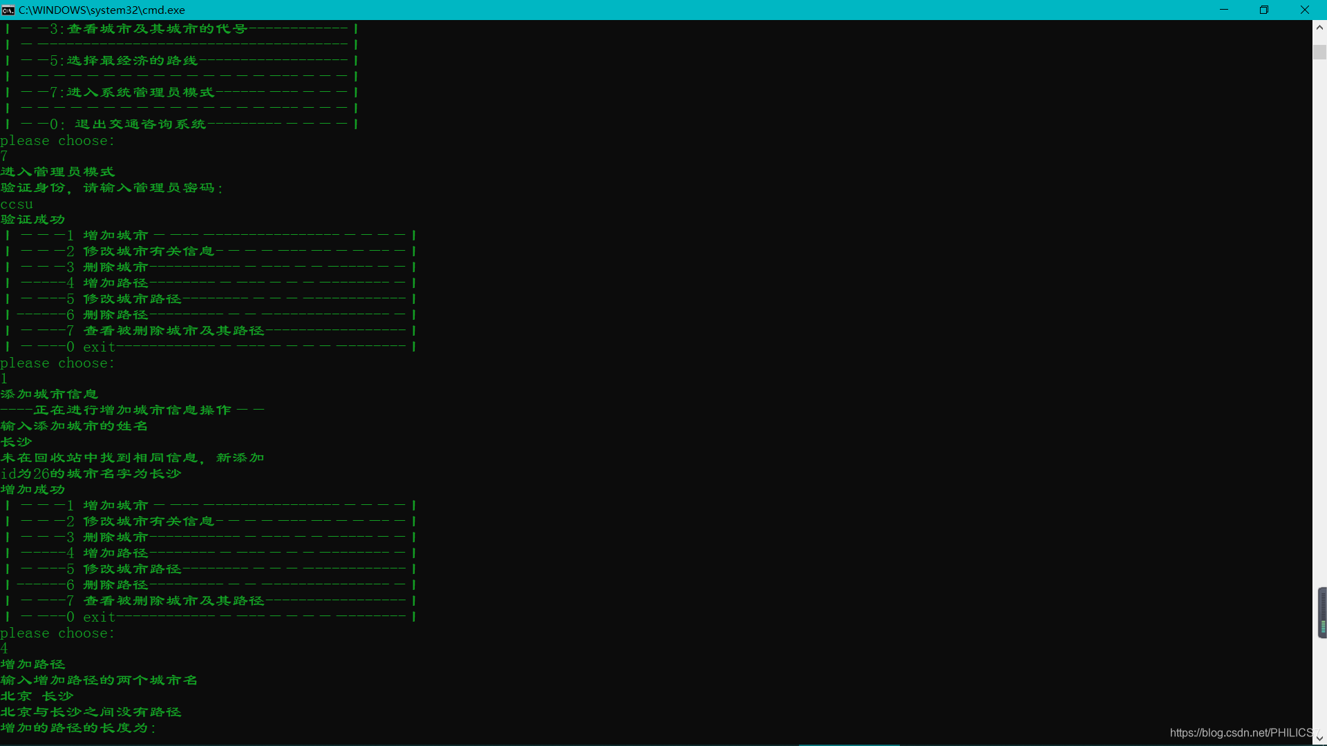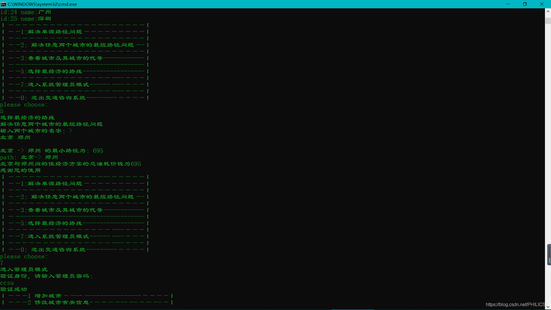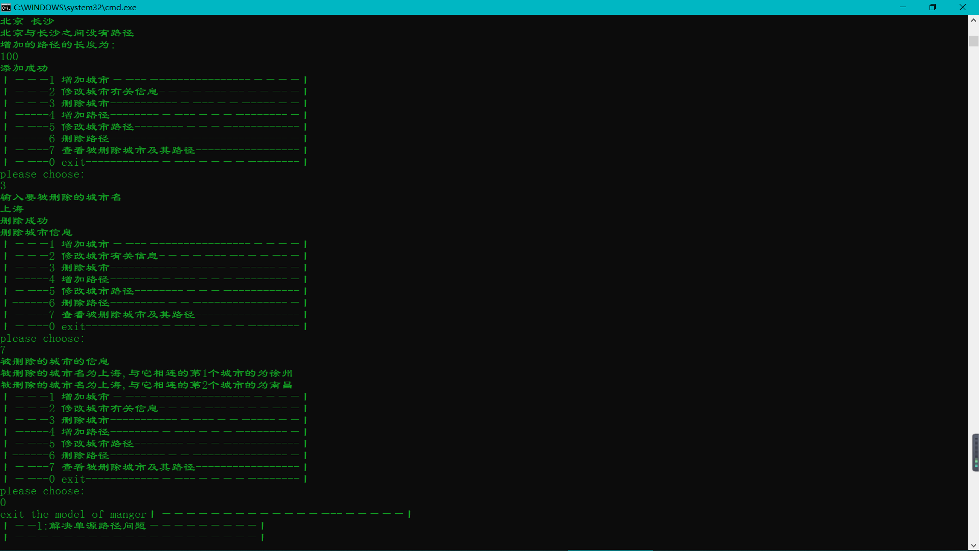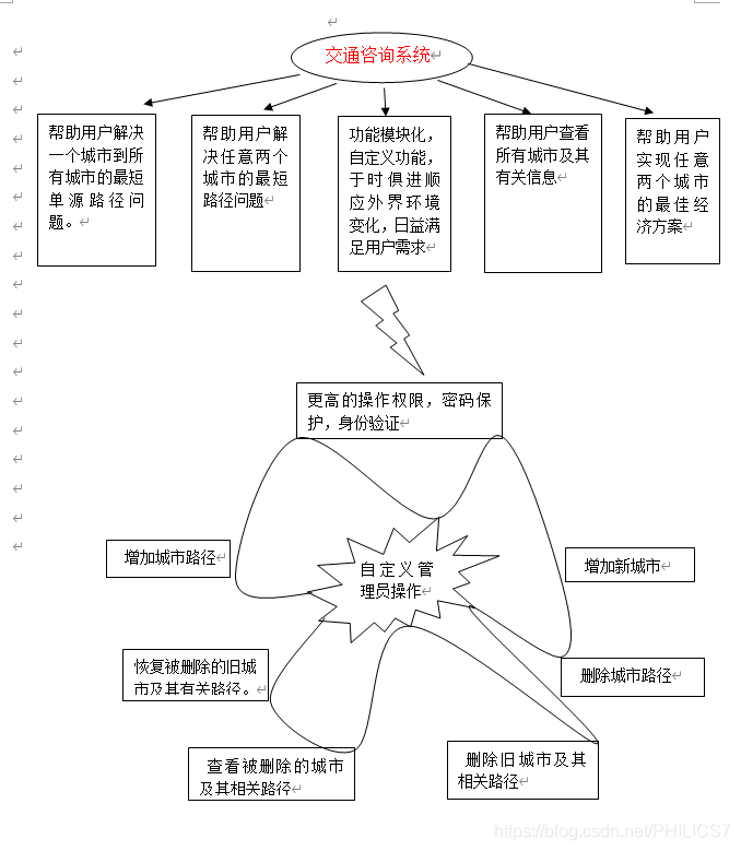 本次所设计的交通咨询系统需要在功能在实现用户在一个交通线路网中,从一个城市到另一个城市的最短路径,以及在路径中所经历的城市结点,能够根据实际变化(如编辑城市,增删城市或变更路径和选择最佳经济路线)做出一系列的调整,以满足用户在现实中的实际需求。