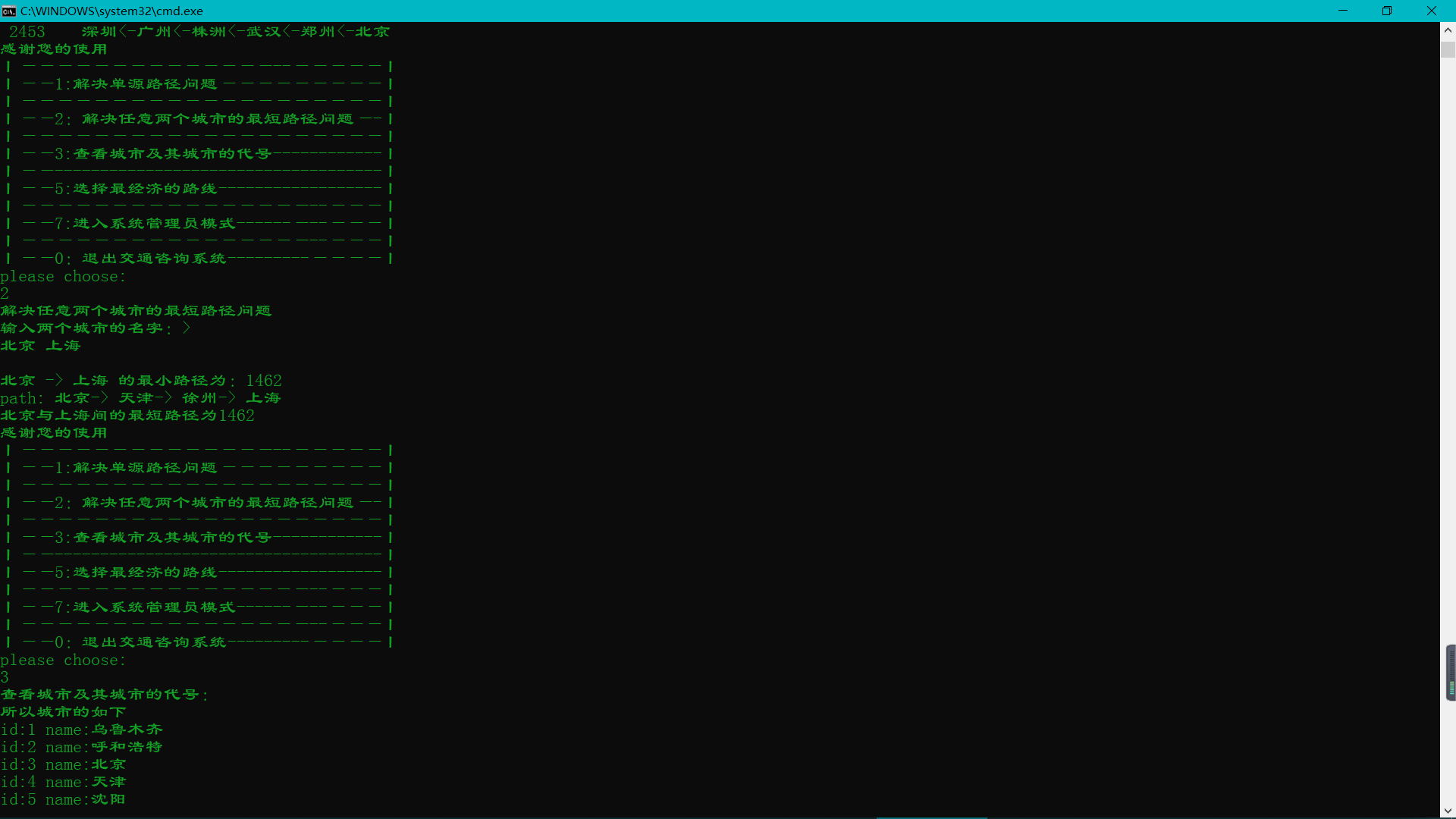 (2)答辩测试数据:北京到乌鲁木齐;北京到昆明;广州到哈尔滨;乌鲁木齐到南昌;沈阳到昆明。