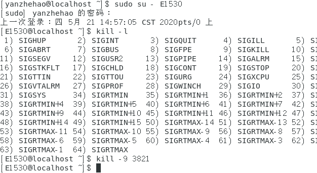 2) 另开启一个终端,在终端通过输入 kill 命令来给进程发送信号,进程的 pid 在程序运行的第一行输出,每次运行程序的时候 pid 是不同的, 我们可以在终端通过输入 kill -l 来查看当前系统当中的信号列表 对于 kill 命令我们可以查看手册: man kill