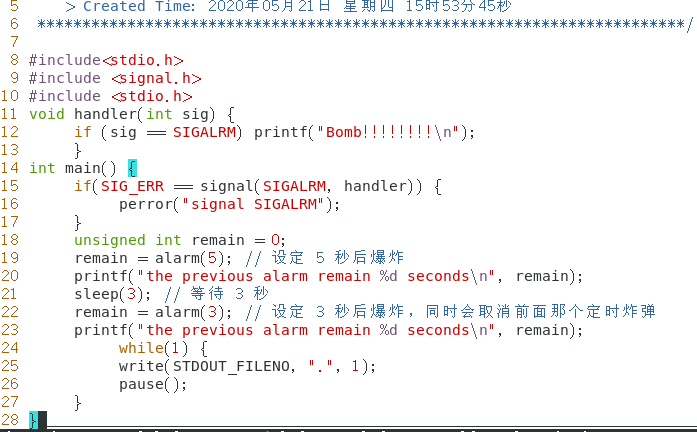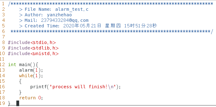 alarm函数在指定数秒后会给当前进程发送SIGALRM信号。进程收到该信号,默认动作终止。