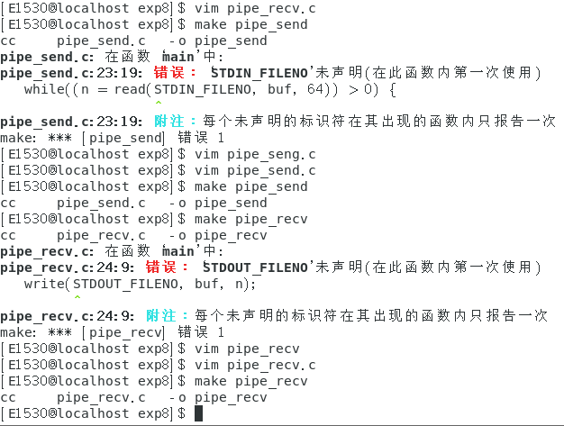 例题:编写两个程序,分别是发送端 pipe_send 和接收端面 pipe_recv 。程序 pipe_send 从标准 输入接收字符,并发送到程序 pipe_recv ,同时 pipe_recv 将接收到的字符打印到屏幕
