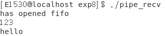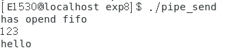现在两个终端都处于阻塞状态,在运行pipe_send的终端输入数据,然后就可以在运行的pipe_recv的终端看到相应的输出: