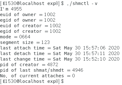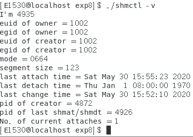 先在另一个终端执行 ./shmctl -a ,然后(5s内)立即在当前终端执行 ./shmctl -v