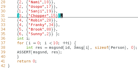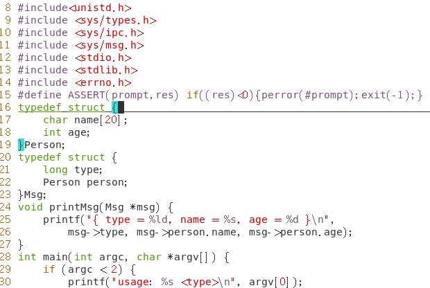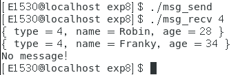 例题:程序 msg_send 和 msg_recv 分别用于向消息队列发送数据和接收数据。 msg_send 程序定义了一个结构体 Msg ,消息正文部分是结构体 Person 。该程序向消息队列发送了 10 条消息。