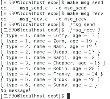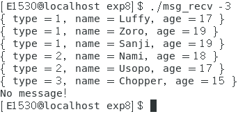 msg_recv 程序接收一个参数,表示接收哪种类型的消息。比如 ./msg_recv 4 表示接收类型为 4 的消息,并打印在屏幕。