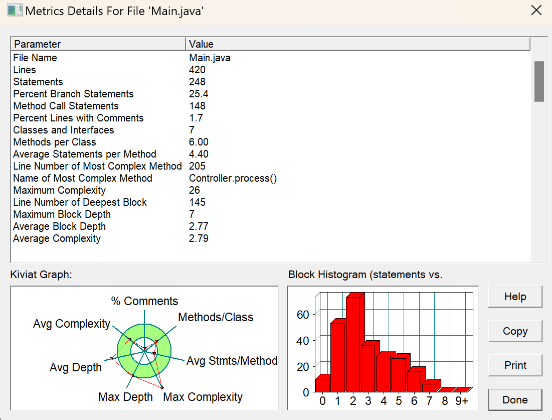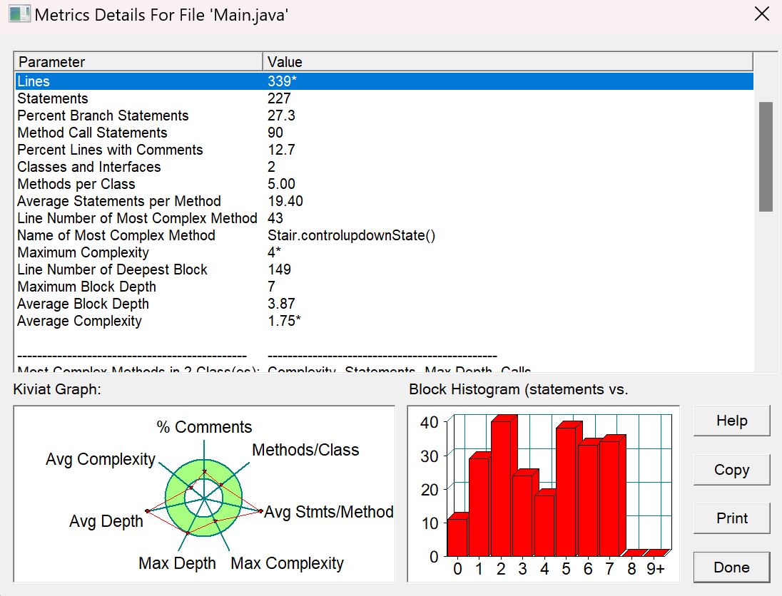 - Maximum Block Depth:7 ,Average Block Depth:2.77 。最大代码块深度为 7 ,意味着代码中存在嵌套层次达到 7 层的代码块(例如if - else、for、while等语句的多层嵌套),平均代码块深度为 2.77 。较深的代码块嵌套会使代码逻辑变得复杂,难以跟踪和理解程序的执行流程,也增加了调试的难度,并且容易出现逻辑错误。